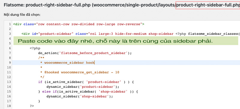 - Chọn file .php quy định layout cho trang sản phẩm: Giao diện – Sửa – chọn theme gốc Flatsome – Woocommerce – Single-product – Layout